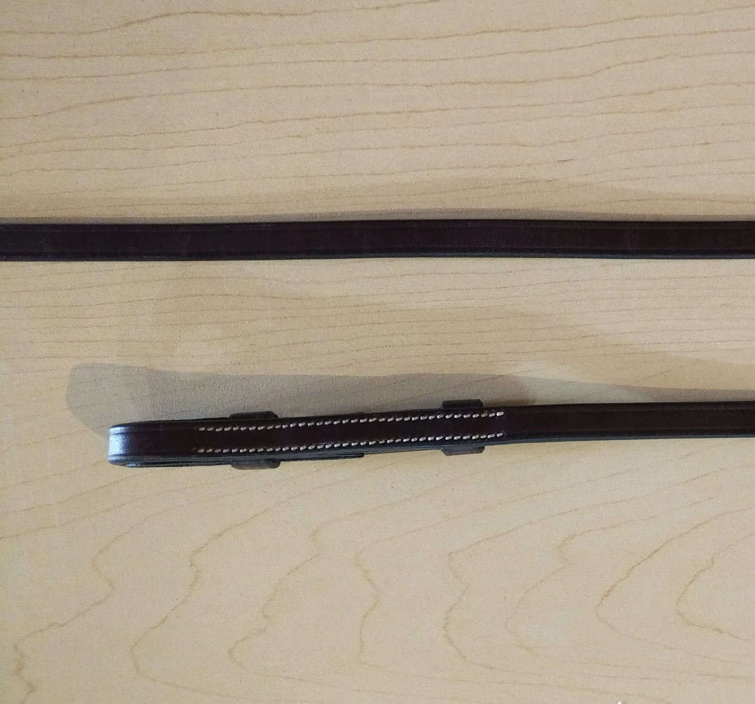 Dy’on 3/8″ Brown Flat Curb Reins with Cream Stitching. Stainless Fittings
