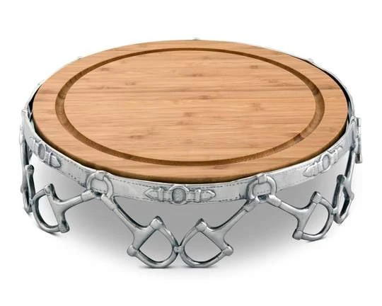 Arthur Court’s unique equestrian motif D-Ring Snaffle Bit design is perfectly translated into a Cheese Pedestal with a removable Board that will be the big winner at your festive occasion. A removable, round 13 inch diameter Acacia serving board finishes