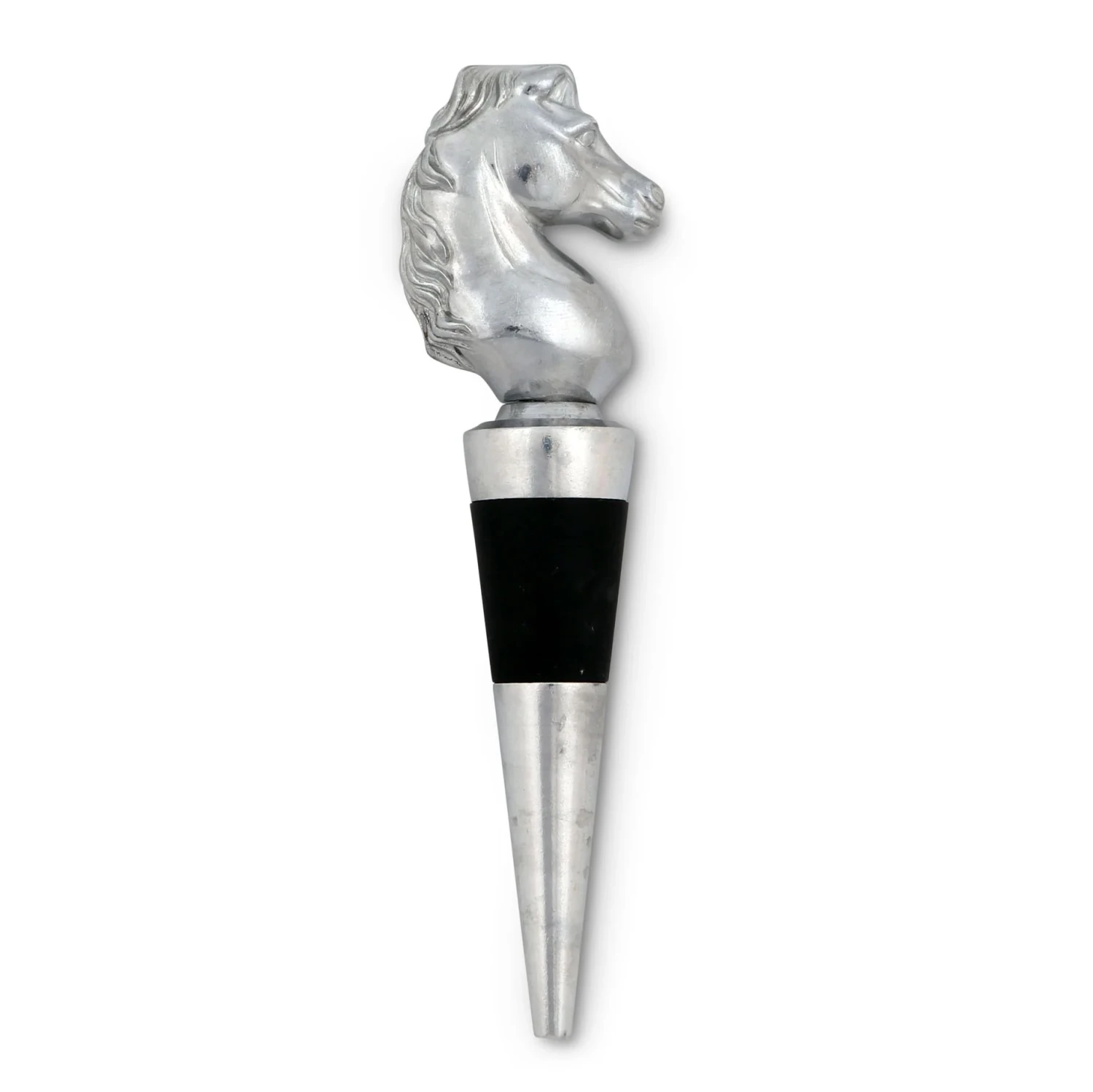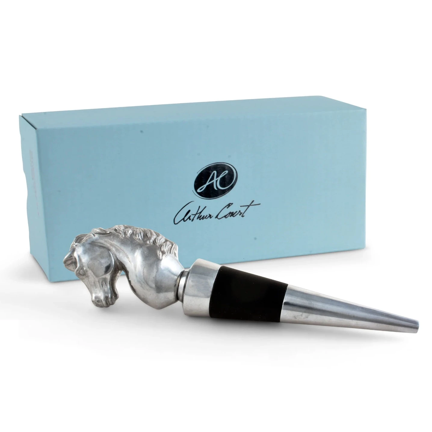 Turn every glass of wine into a special occasion when you stopper your bottles with this dramatic horse bottle stopper from Arthur Court. This elegant statuette comes in a gift box that makes it perfect as a hostess gift or special present for the equestrians and horse lovers in your life, and your friends will appreciate the substantial and high-quality feel when they hold it. Show it off among your crystal decanters and fine wine collection, trusting in the incredibly tight fit of the rubber gasket to protect your wine. The nobly shaped head of this stallion and its flowing, graceful mane are handcrafted in sand-cast aluminum, all the better to show off the realistic detailing of the design. Care for this handsome bottle stopper is easy, requiring only hand-washing and immediate drying.