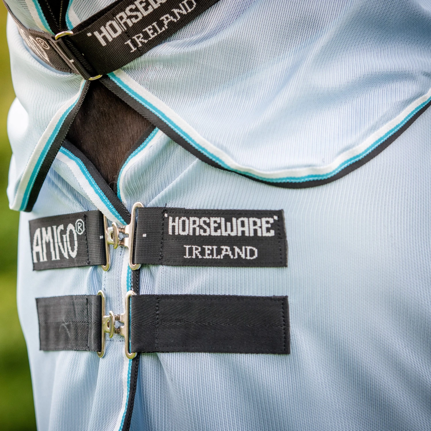 Horseware Ireland’s Amigo Bug Rug offers excellent value protection. It is soft, and durable with strong sun reflecting properties. Features of this rug include Improved hood shape for greater coverage when grazing, front leg arches, classic front closures, shoulder and mane lining to prevent rubbing, removable neck cover, cross surcingles, and a light blue material to reflect sunlight.