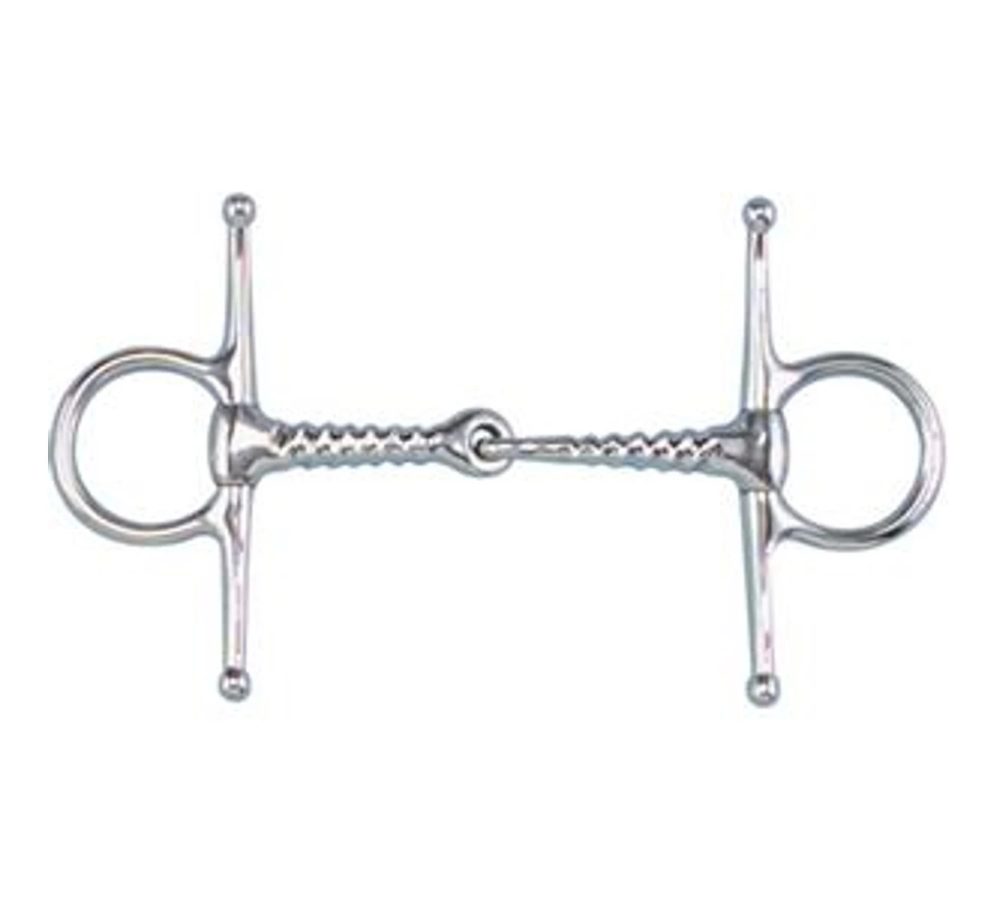 Pony Corkscrew Snaffle Full Cheek bit from Toklat is constructed of durable stainless steel. Corkscrew twist design has more “bite” than a slow twist and affords more control. Full cheek style pony bit has 4.75″ size cheeks. Bit available in size 4.5″.