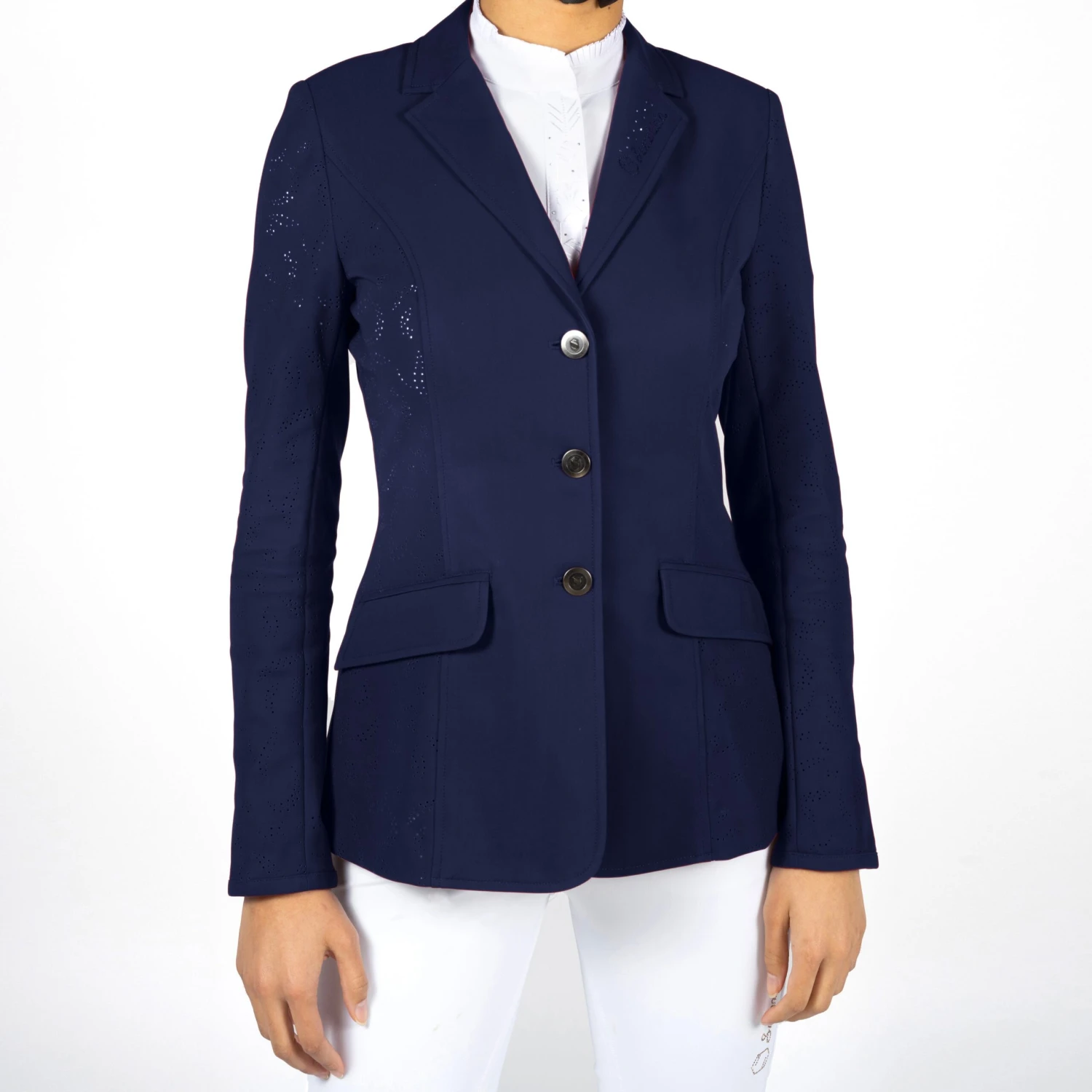 The sides, sleeves and back feature a stunning ‘leaves in the wind’ micro perforated design, further enhancing the breathability. Micro Swarovski Crystals embellish the dot embossed Samshield on the lapel. The flap pockets cover the hidden zipper underneath.