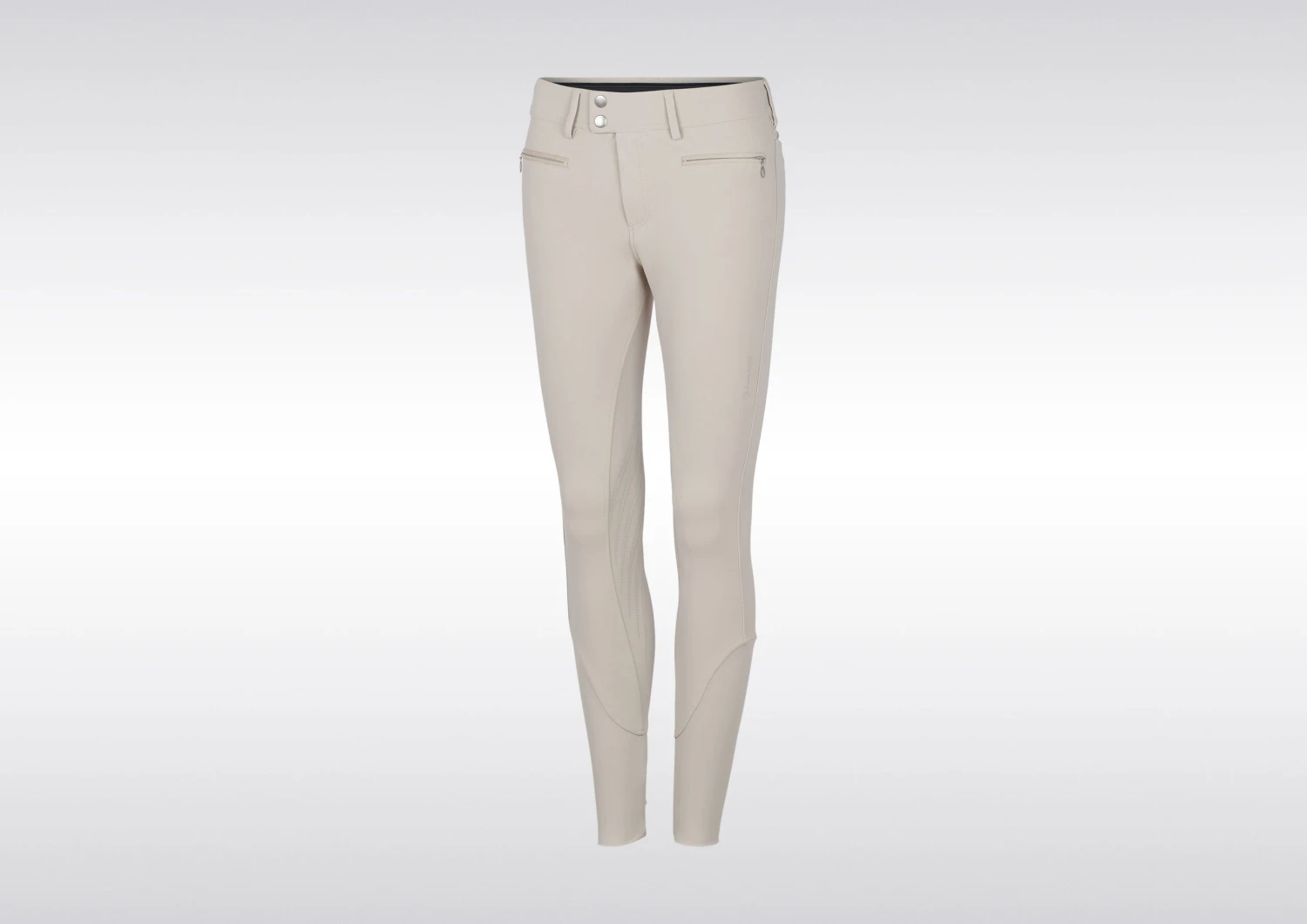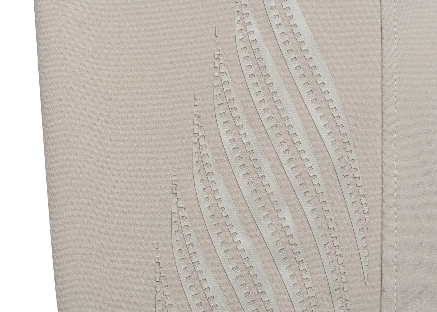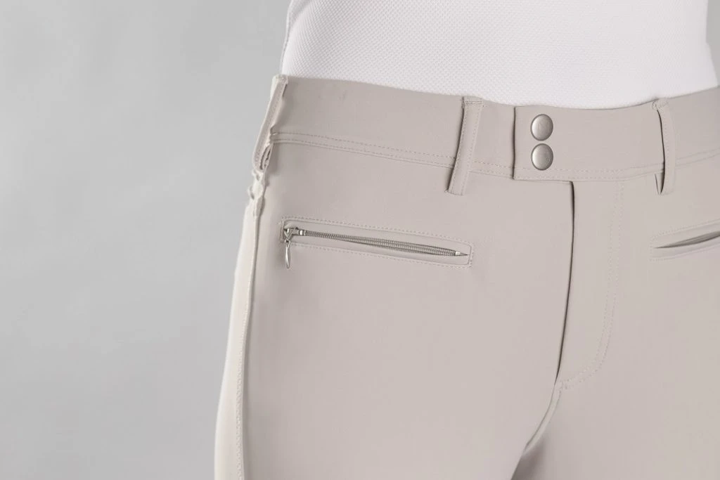 The elasticated fabric guarantees high breathability and wind protection. The heat activated silicone knee grip ensures stability and adherence to the saddle. The compression fabric offers a smoothing fit, and the elastic tape inside the belt is equipped with silicone which prevents the shirt from rising. Thanks to the special construction of the fabric, the Clotilde breeches offer protection against ultraviolet rays. The breeches are embellished with a very subtle Samshield tone-on-tone embossing on the rider’s thigh. Alcantara fabric adds gentle accents to the hidden zipper front, and faux rear pockets, combining technical performance and elegance.