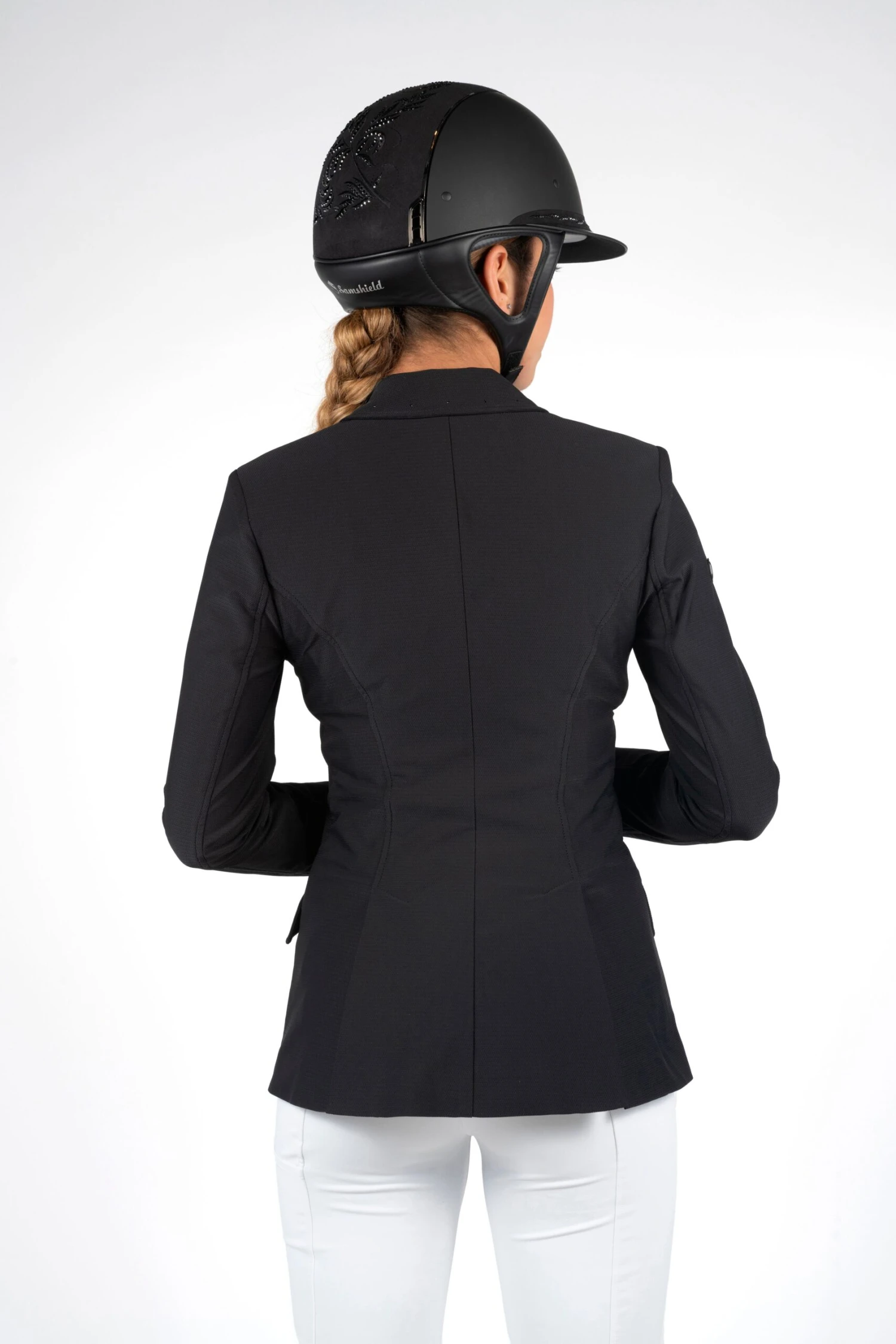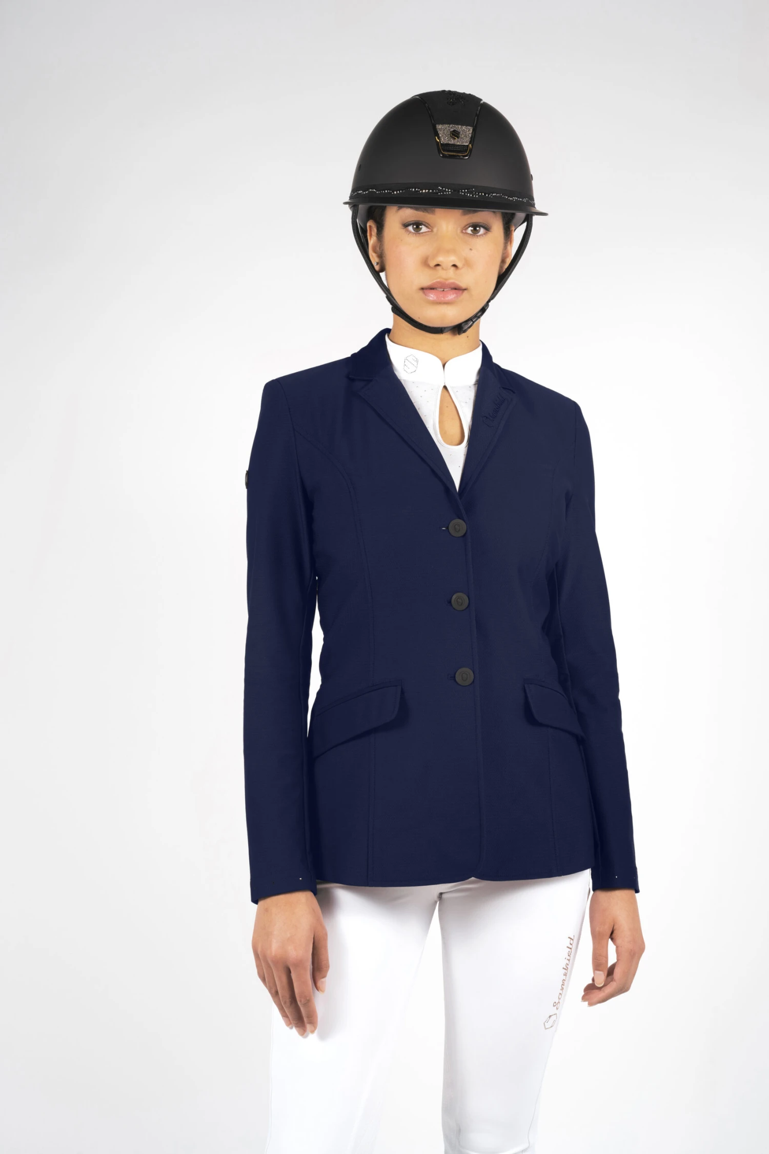 A hidden front zipper helps the ultra light fabric keep a clean smooth shape. It does not have a lining to ensure maximum ventilation. Beautiful and subtle accents include: Black Swarovski crystals embellishing the neck and cuffs, Samshield shoulder badge, Matt Black Samshield metal buttons, Black Alcantara trimmed pockets, and embroidered lapel.