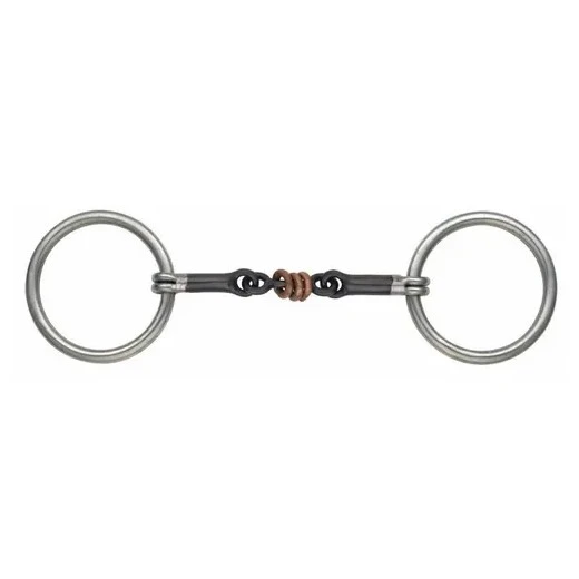 With a sweet iron mouthpiece designed to produce a sweet taste and encourage salivation as it oxidizes. The addition of copper ribs help to prevent the horse from taking to much contact, a good deterent for horses that tend to take hold. The double jointed mouth with rollers is good for horses with busy mouths.