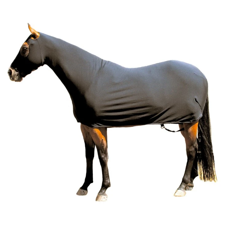 Looking for that “all over” shine? The Sleazy Sleep Wear Full Body provides your horse head to tail coverage. A full separating zipper from chin to chest allows easy dressing. They also have adjustable rear leg straps with snap hook closures, come in 7 sizes and are made of either nylon or polyester spandex. The body portion is reinforced along the back to prevent over-stretching. Sizing is calculated the same way as a traditional blanket. Stocked in Black.