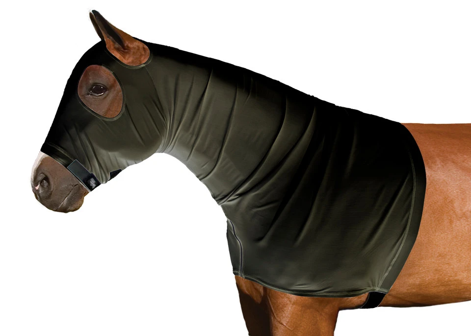 This lycra stretch hood is the original horse pajamas. Featuring the“Seamless Face” design, the Sleazy hood eliminates any seams below the eyes for maximum safety. So versatile, this mane tamer can of course train the mane, but it also makes a wonderful liner to use under heavy winter blankets. The perfect thing to have in your show or tack box the Sleazy hood is great to protect braids and keep your horses face and mane clean between classes while at a Show. The Sleazy hood can also protect the horses hair from sun damage.