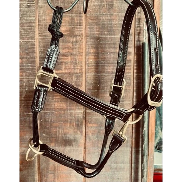 The Rope Nose British Halter. A harmonious blend of craftsmanship and functionality, this halter redefines control and comfort. Elevate your horse’s experience with Walsh’s commitment to quality. This hybrid British Halter features double knotted rope on the nose, single layer rope with brass ring under the chin, triple stitched Havana leather and brass hardware.